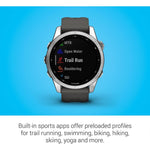 Push your limits and get stronger with the Garmin fenix 7S Standard-Edition Multisport GPS Smartwatch. Featuring an easy-to-read 1.2" display that's built for smaller wrists, shock- and water-resistant polymer case, and a long-lasting rechargeable lithium battery, this Garmin watch is built to sustain your athletic and outdoor challenges. Use trusted button controls or the new touchscreen interface to access selections. This smartwatch provides performance insights and metrics from recorded activities that help you manage your exertion and build stamina, plus you can optimize recovery with built-in monitoring of heart rate, respiration, stress, sleep, and more. The Garmin fenix 7S boasts outdoor navigation sensors and new multi-band GNSS technology to guide you with a higher level of positioning accuracy, even in challenging environments. Delivering preloaded TopoActive maps and worldwide ski and golf maps right on your wrist, this Garmin smartwatch includes a plethora of built-in sports apps to keep up with your active lifestyle. Keep connected with features like smart notifications when connected to a compatible smartphone, built-in music storage, and Garmin Pay contactless payments in supported countries and payment networks. Runs up to 18 days in smartwatch mode and up to 57 hours in GPS mode.