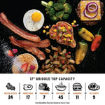 - Heavy duty rolled steel griddle plate with 267 sq. in. cooking area