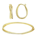 Value and elegance combine in this adult hoop earring and bangle bracelet set from Brilliance Fine Jewelry. Crafted in sterling silver with 14KT gold plating and glittering simulated diamonds. The hoop earrings measure approximately 23mm x 18mm with a click top closure. The bangle bracelet has an inner diameter of approximately 64mm. Both pieces feature pave simulated diamonds in a crossover design. Arrives in an elegant black hexagon shaped black box with velvet insert. Makes a great gift for that special someone.