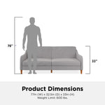 - Futon dimensions: 77"L x 32.5"W x 33"H. Sleeping dimensions: 71"L x 43.5"W x 16.5"H. Weight limit: 600 lb.