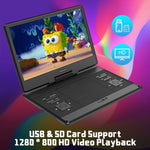 This DR. J Professional new 14" portable DVD player has a 180° rotating and 90 flipping eye protection screen, a resolution that can reach 1280x800, and a TFT/LCD widescreen high contrast display, this product's net content 3.22lb which is very suitable for putting on the car seat, giving you an excellent visual experience.