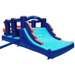 Bring the thrill of an obstacle course right to your backyard with the Hapcap Inflatable Obstacle Course Bounce House with Slide. Designed specifically for children aged 3 to 10 years, this inflatable play structure combines fun and physical activity through its boxing-themed obstacle course design. It features a large slide for exciting descents, two climbing walls that challenge coordination and strength, and two small jumping areas that encourage active play. Crafted from commercial-grade PVC and reinforced with 840D Oxford cloth, this bounce house ensures superior durability, air tightness, and load-bearing capacity to safely support up to 400 pounds. The thick mesh enclosure provides added safety by preventing accidental falls while allowing parents to keep an eye on their children. Suitable for both indoor and outdoor use, the bounce house comes with a powerful electric blower for easy setup and takedown. Included accessories such as ground stakes secure the unit outdoors, while a storage bag and repair kit offer convenience and maintenance support. Additionally, a basketball with an inflation pump adds variety to playtime activities. This inflatable obstacle course is perfect for birthdays, family gatherings, or any occasion that calls for active fun in a safe environment.