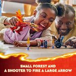 The LEGO NINJAGO Kai's Source Dragon Battle adventure playset offers an immersive building and play experience for kids aged 4 and above. This set features a dynamic red dragon model that can be posed by moving its jaw, head, tail, legs, and four wings to recreate exciting scenes from the NINJAGO Dragons Rising TV show. Included are four ninja action figures: Climber Kai and Wyldfyre each wielding katana swords, alongside a Wolf Mask Guard with a spear and a Wolf Mask Warrior with a sword. The set also contains a small forest build designed to trap characters, a powerful shooter vehicle capable of firing a large arrow, and three flame elements to add dramatic effects. Designed with young builders in mind, the set includes a Starter Brick that provides a partly constructed base to help kids build confidently and quickly. With 120 plastic pieces crafted for durability and creative play, this LEGO set supports skill development in engineering and storytelling while providing hours of imaginative fun.