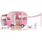 - CAMPER TRANSFORMS TO 3' CAMPSITE PLAYSET FOR 360° PLAY: Pop up the top, the front and the side panel to reveal 7 play areas: Kitchen, Bed, Shower, Hammock, Fashion Closet, Awning Hangout and Dining Area. Includes working wheels, windows & drawers and many accessories.