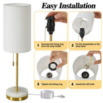 The NATYSWAN Minimalist Table Lamp Set of 2 combines modern design with practical functionality to brighten your living spaces. Each lamp features a sturdy marble base that prevents tipping and adds a touch of luxury, complemented by a metal frame and a white linen fabric shade that diffuses light softly to protect your eyes during reading or work. The pull chain switch offers convenient on/off control, while the standard E26 bulb base supports LED bulbs for energy-efficient lighting. These compact lamps are ideal for bedrooms, living rooms, offices, or any small space needing stylish accent lighting. Their minimalist gold finish and clean lines blend effortlessly with contemporary décor styles, making them both decorative and functional additions to your home environment. Easy to assemble and designed for durability, this set enhances ambiance while providing reliable illumination for various activities.