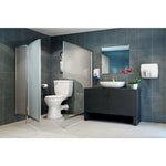 The SaniBest Pro is a system that is used to install a complete bathroom up to 25 ft. below the sewer line, or even up to 150 ft. away from a soil stack. The SaniBest Pro can handle the effluent from a toilet, sink, bathtub, shower and washing machine (indirect connection). While most of our pump range consists of shredders/macerators, the SaniBest Pro incorporates an actual grinder system. The SaniBest Pro is ideal for situations where you do not control the use of it (i.e. rental unit, offices, warehouses, etc. The SaniBest Pro is designed to deal with sanitary napkins that may have been flushed down the toilet; such may consist of condoms, sanitary napkins, q-tips, dental floss, etc. The wastewater from other sanitary fixtures is discharged into the SaniBest Pro via two 2 in. inlets on either side of the housing. The discharge elbow on top of the SaniBest Pro can be rotated 360° depending on the discharge installation. A non-return valve (included in assembly) prevents back flow into the unit. This unit has been designed with a vent connection on the lid. All plumbing codes require connection to a vent system. Please note that the vent system should be a 2-way air vent. The uses of mechanical vents, air admittance valves or similar devices are not permitted as these are considered 1-way air vent systems. It is highly recommended for the system to be connected to a Ground Fault Interrupter (GFI) circuit.