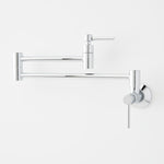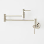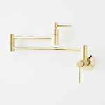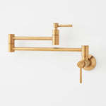 Signature Hardware 955096 Features: Faucet body constructed of metal Single hole mounting type Wall mounted faucet installs on the wall directly above sink Double lever handles control the flow and temperature of water Includes ceramic disc cartridge Signature Hardware 955096 Specifications: Height: 8-15/16" Spout Reach: 22-3/4" (center of faucet body to center of spout outlet) Flow Rate: 4.8 gallons-per-minute Faucet Holes: Single Hole